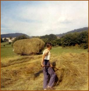 Et il faut le réussir, toute une technique : commencer par regarder la météo… pas de pluie, pas d’orages, on peut faucher. Après, il faut laisser sécher l’herbe et la retourner pour qu’elle sèche bien, puis regrouper le foin en ligne : faire les andains et pour passer la nuit ou si l’orage menace on met en cuchons. Le foin sec, on fait le chemin devant le char ; à la fourche il faut bien alterner les chargeurs pour avoir un char équilibré. Le ou les cogneurs chauchent pour mettre plus de foin et éviter qu’il ne glisse. Devant, derrière le char les râteleuses s’activent pour laisser le champ propre. De retour à la ferme, il faut monter à la déchargeuse et ranger le foin, bien sec, au fenil pour l’hiver. l